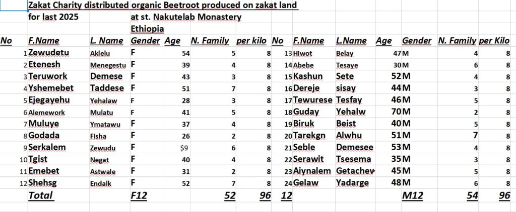 Highlights in 2025 were building a mosque and growing beets on our own land. Here are the details of the distribution to 106 poor: